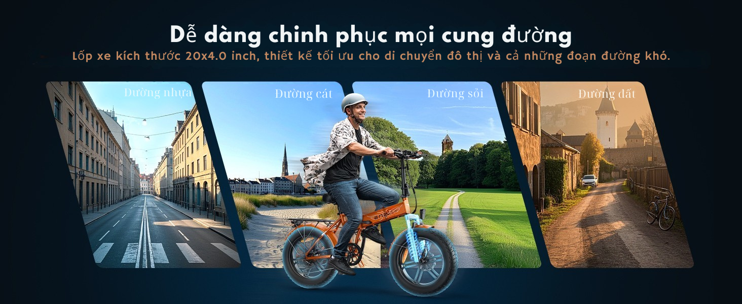 ENGWE EP2 Boost sử dụng lốp béo kích thước 20 x 4.0 inch, mang lại diện tích tiếp xúc mặt đường lớn hơn, giúp xe luôn giữ được độ bám ổn định trong quá trình di chuyển. Nhờ đó, xe vận hành êm ái hơn trên đường nhựa, đồng thời dễ dàng vượt qua các bề mặt khó như đường sỏi, đá, đất hay những đoạn cát nhẹ mà vẫn giữ được sự cân bằng vốn có.